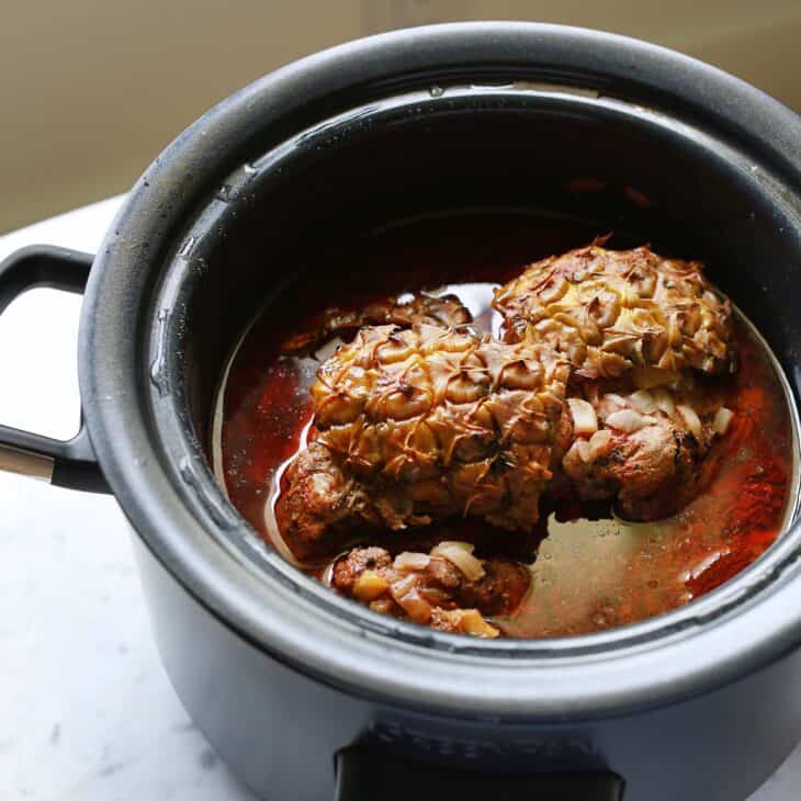 Add the chicken stock, chipotle peppers in adobo, lime juice, diced onion, and 1/3 of the pineapple cut into small chunks. I also place the outer skin of the pineapple over the top of the meat while cooking.